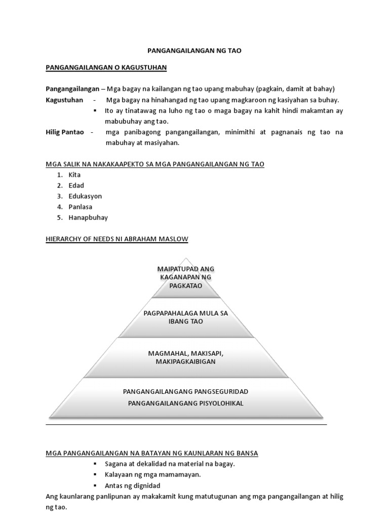 Ang kinikita ng mga tao na kabilang sa pamantayang iti ay sapat lamang upang matugunan ang kanilang pangunahing pangangailangan Decency Standard ang kitang tinatanggap ay mas mataas na magagamit nila sa pagpili nh mga uri ng produkto na makatutugin sa kanilang pangangailangan at magibg sa kagustuhan. 372016 TEORYA NG PANGANGAILANGAN HIERARCHY OF NEEDS Psychological Needs. Ito ay tumutukoy sa mga.