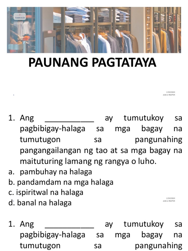 Ispiritwal na halaga b. Ito ang mga bagay na kailangan ng ating katawan upang manatiling normal ang takbo nito. 2 question 1.