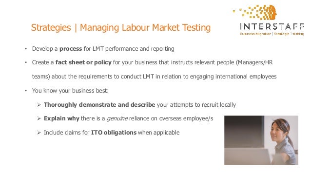 11242020 The Labour Market Testing requirement introduced in November 2013 tasks regular business sponsors to test the local labor market before recruiting a nominated role for an overseas worker. The sponsoring employer must conduct a Labour Market Testing for the position occupation that they wish to nominate the applicant for unless International Trade Obligations ITO applies and must be undertaken. Labour market testing LMT generally involves advertising the position in Australia.
