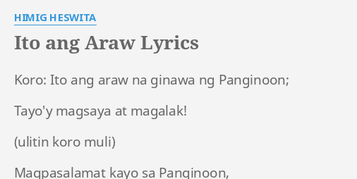 Aquino SJ Performed by Himig Heswita Category. ITO ANG ARAW LYRICS Ito ang araw na ginawa ng Panginoon Tayoy magsaya at magalak Ito ang araw na ginawa ng Panginoon Tayoy magsaya at magalak Magpasalamat kayo sa Panginoon Butihin Sya Kanyang gaway walang-hanggan Sabihin ng sambayanan ng Isarael Walang-hanggan Kanyang awa. Koro Kanang kamay ng Diyos sa kiy humango.