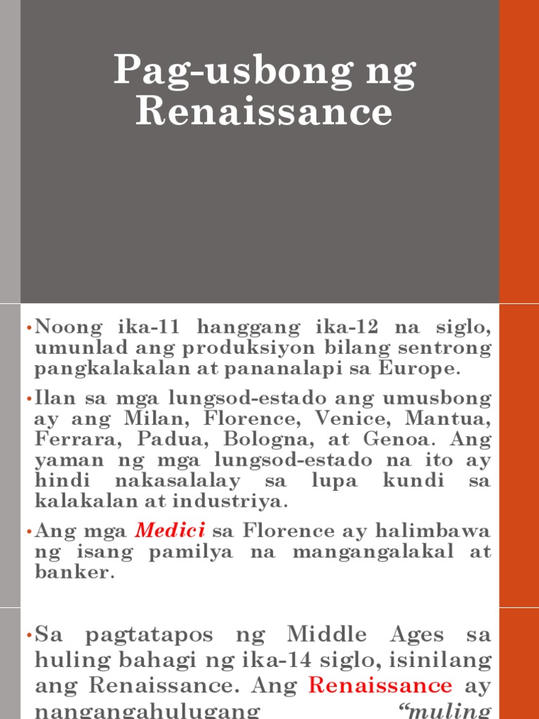 Nagsimula ang renaissance sa Hilagang Italya. Venice Florence milan at genoa. Ipinag-utos ang pagpatay sa mga tao edad 10 pataas kaya ang pangyayaring ito ay tinawag na Balangiga Masaker 4.
