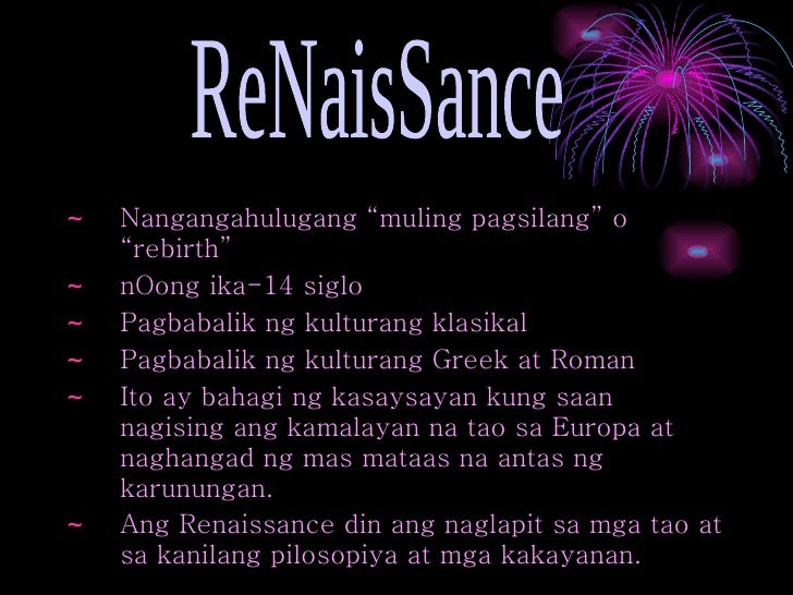 6192015 Sa salitang Pranses ito ay nangangahulugang. Isang kilusang kultural o intelektuwal na nagtangkang ibalik ang kagandahan ng sinaunang kulturang Greek at Roman sa pamamagitan ng pag-aaral sa panitikan at kultura. Pagsusulit tungkol sa Renaissance Ito ay nangangahulugang rebirth o muling pagkabuhay.