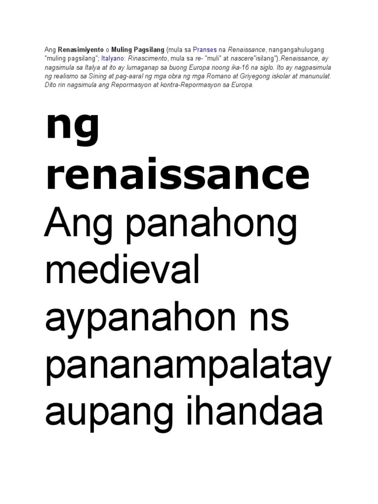 Matatagpuan din ang salita sa. Nagbibigay- linaw ang pahinang ito na nangangahulugang ito ay tumuturo sa mga artikulong mayroong magkaparehong pangalan. Kahulugan ng Renaissance Ito ay nangangahulugang muling pagsilang o rebirth.