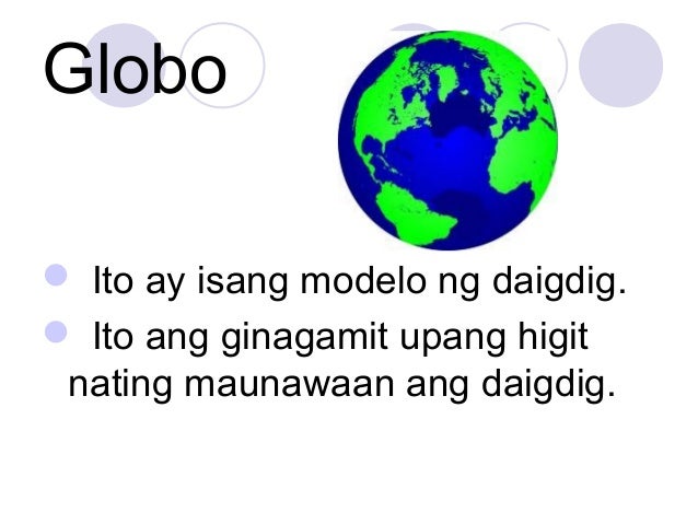 Globo - Ito ay modelo ng mundo Ekwador - Ang guhit na pahalang na naghahati sa globo sa hilaga at timog hemispero na nasa 0. Pahalang 1tawag sa mga guhit na 3Ito ang modelo ng daigdig patayo mula polong hilaga patungong polong timog na nakpalibot 4Ito ay patag na representasyon sa globo ng mundo 2Ito ay ang pagtatagpo ng mga guhit latitud longhitud sa globo o mapa 5Ang tawag sa mga guhit na makikita sa globo at mapa ng mundo. Ito ay Ang modelo ng modelo ng mundo o representasyon.