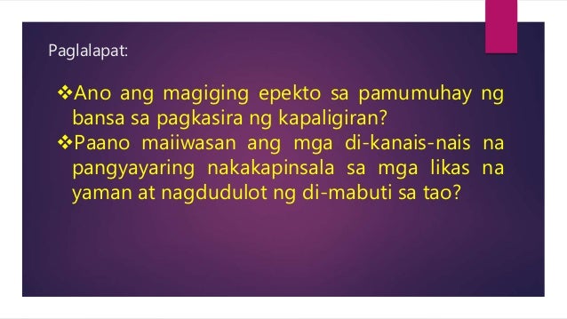 Sa loob ng tahanan nagsisimula ang edukasyon at wastong pagpapalaganap sa paggamit ng likas na yaman c. 6272017 Suliranin ding pangkapaligiran ang climate change o pabago bagong klima lubos namang naapektuhan ang mga magsasaka dahil sa sobrang init at ulan ay nangangamatay ang kanilang mga pananim at mga alagang hayop. Upang ating mapangalagaan ang mga ito kailangan ay ipag bawala ang pag tatapon ng mga basura sa mga.