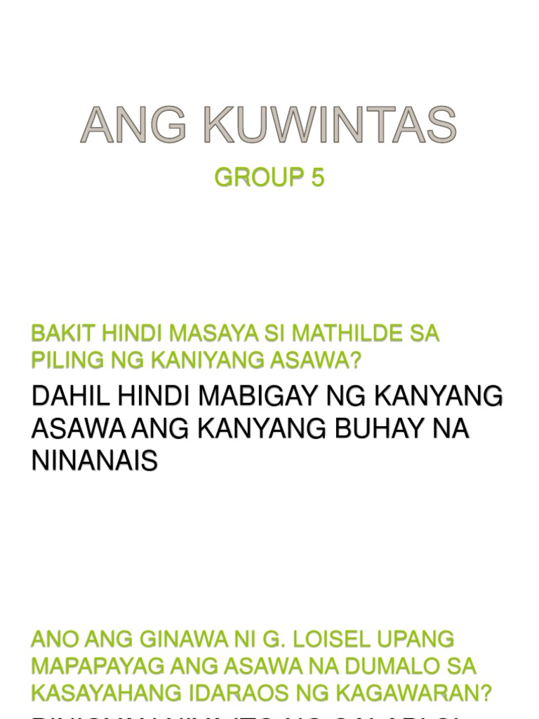 Natupad ba ang Gawain 12 Pagsagot sa mga Tanong Sagutin nang mahusay ang mga tanong. Bilang Kristiyano ito ang ang tamang panahon upang kilalanin attanungin natin ang ating sarili kung ano ang dahilan o dapat gawin parasa pinakaaabangang selebrasyon3. Anu-ano ang nais ni Mathilde na mangyari sa kanyang buhay.