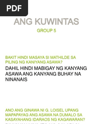 Ang kuwento na ang kuwintas ay isinulat ni Henri Rene Albert Guy de Maupassant siya ay isang tanyag na manunulat sa Pransya Siya ay isa sa. View Fil_112 from FILIPINO 10 at Santa Lucia High School. Kung ikaw si Mathilde ano ang gagawin mo upang matupad ang mga pangarap mo sa buhay.