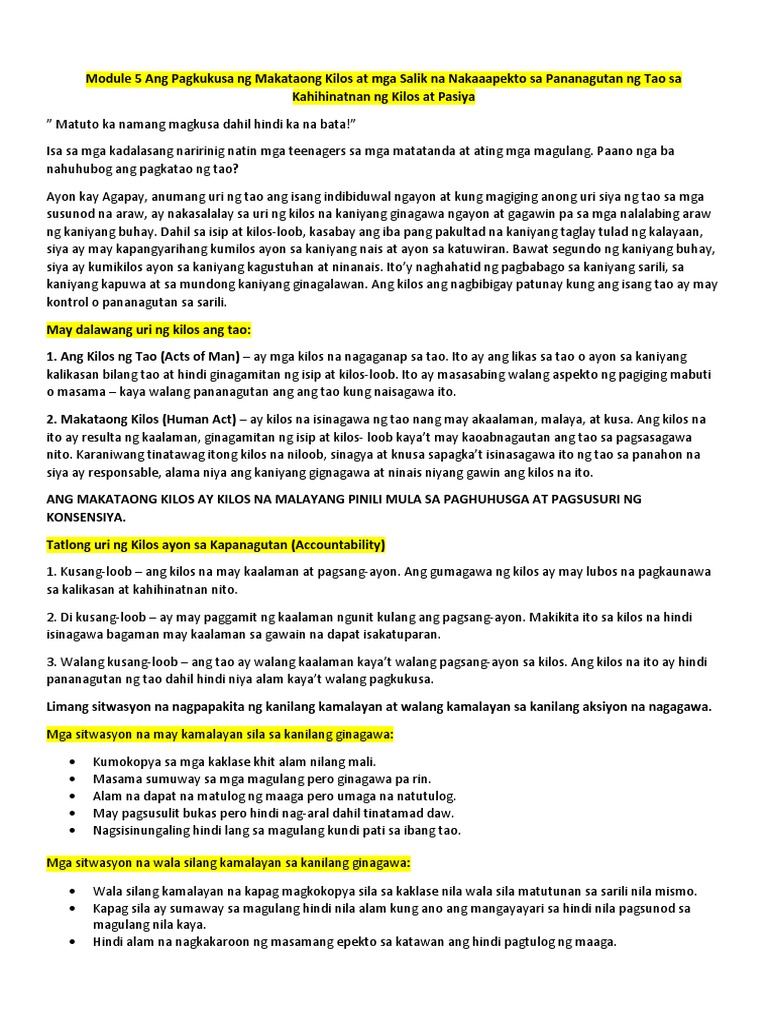 Module 5 Ang Pagkukusa Ng Makataong Kilos At Mga Salik Na Nakaaapekto Sa Pananagutan Ng Tao Sa Kahihinatnan Ng Kilos At Pasiya
