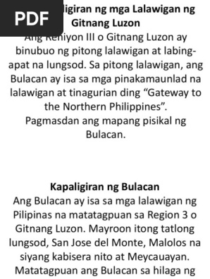 Matagal nang panahon ang nakalilipas nang ang isang pangkat ng mga Kastila ay maglibot sa isa sa mga lalawigan sa may timog sa Gitnang Luzon. Kasaysayan ng mga lalawigan sa gitnang luzon. Florina Yamsuan Orillos-Juan Panimula A ng pagdami ng bilang at ang kasunod na pananalasa ng balang ay palagiang banta sa isang agrikultural na bansa kagaya ng Pilipinas.