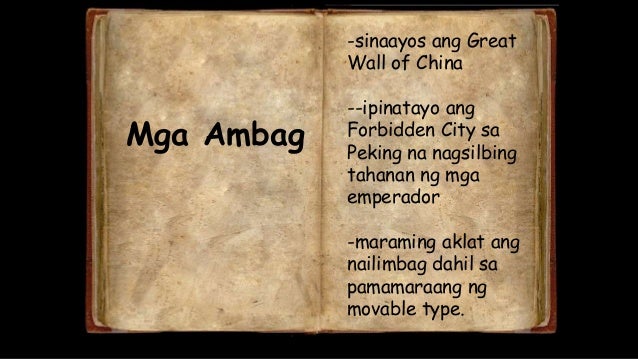 Forbidden City FileForbidden_City_Cour tyardjpg Ming 1368 - 1644 Ang malaking bahagi ng Great Wall ay itinayo sa ilalim ng dinastiyang ito. 1282015 Mga Ambag -sinaayos ang Great Wall of China --ipinatayo ang Forbidden City sa Peking na nagsilbing tahanan ng mga emperador -maraming aklat ang nailimbag dahil sa pamamaraang ng movable type. Sa dinastiyang ito nagsimula at lumaganap ang kaisipang Mandate of Heaven 4.