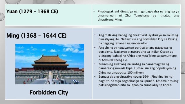 Ming dynasty 1368 - 1644Ipinatayo ang Forbidden City sa Peking sa dinastiyang ito. Yumabong sa dinastiyang ito ang kaisipang humubog sa kamalayang Tsino tulad ngConfucianism Taoism at Legalism5. Pagkaraan ng 500 taon dalawang dynasty sa loob ng huge palace na ito naipon ng mga emperador ng Tsina ang countless na treasures na kilabibilangan ng mga gold at pilak lacquerware chinaware painting.